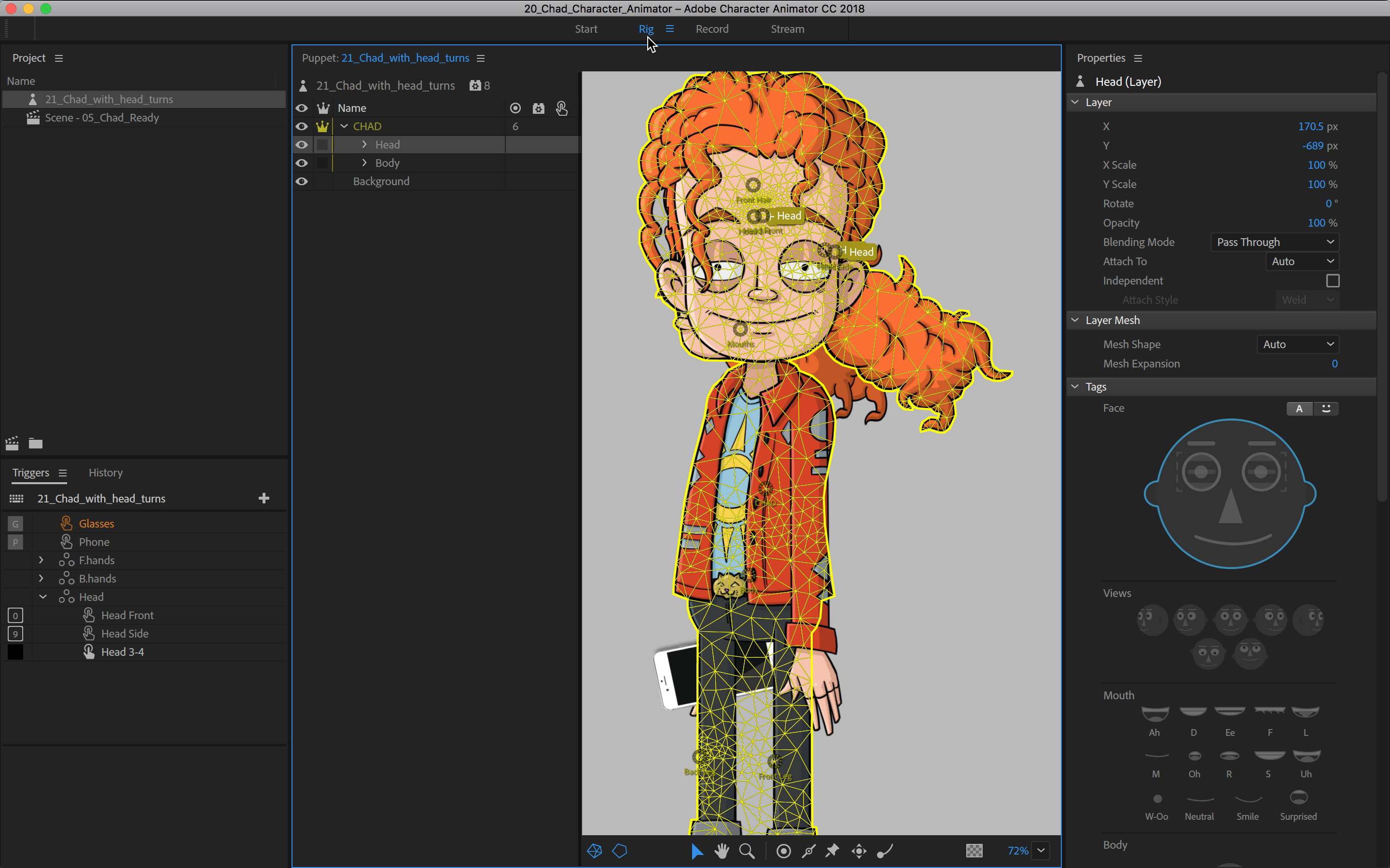 You will learn how to take a PSD into Character Animator to rig up for proper animation. This includes tagging the mouth poses, pinning the rig down, adding draggable points and more.